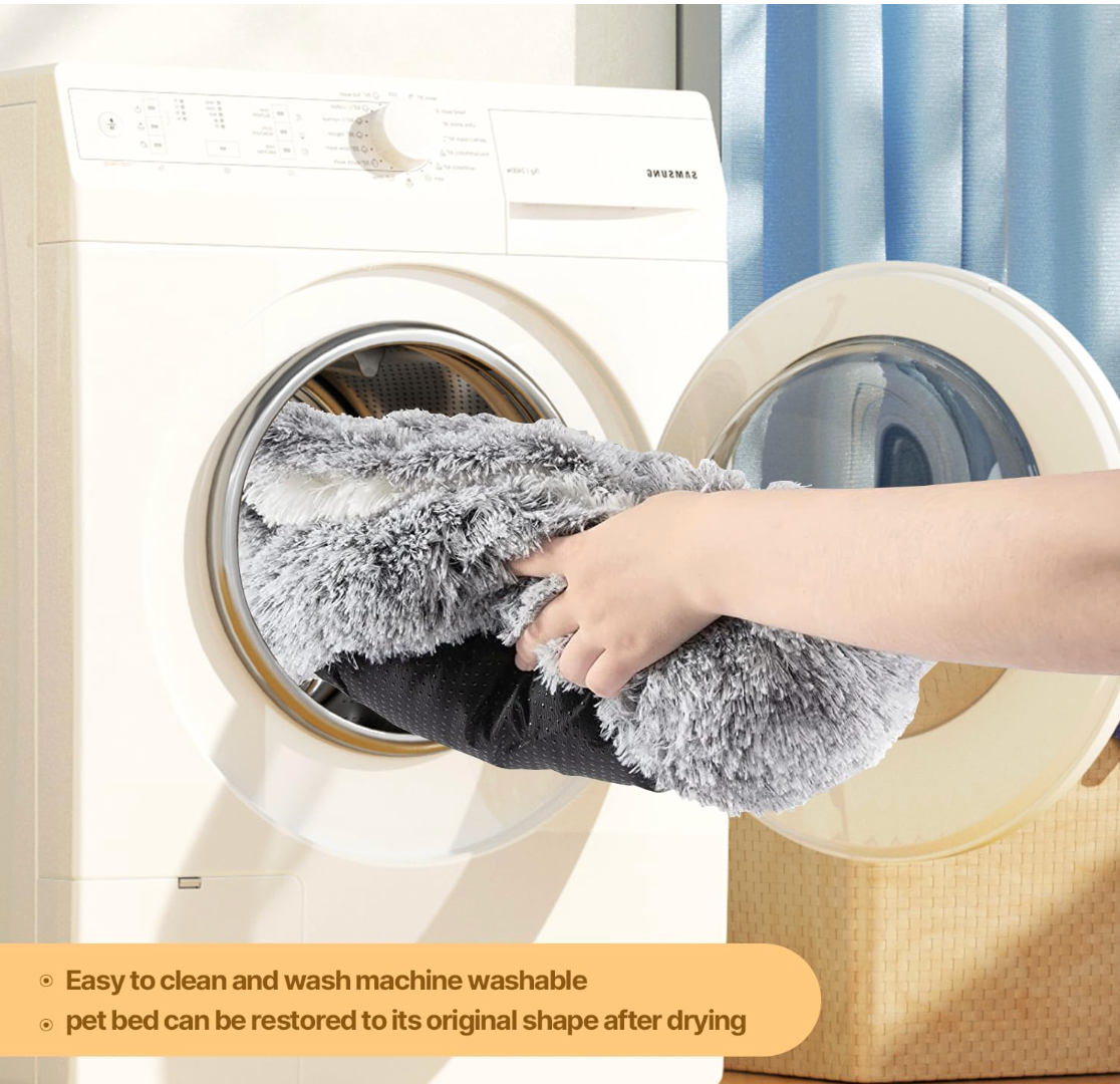 Easy Maintenance: Our pet bed is very easy to clean. No zippers to fuss with, just throw the whole bed in the machine and choose a gentle cycle. Do not bleach. To prevent matting, you'd better dry the bed in the DRYER on low heat after washing.