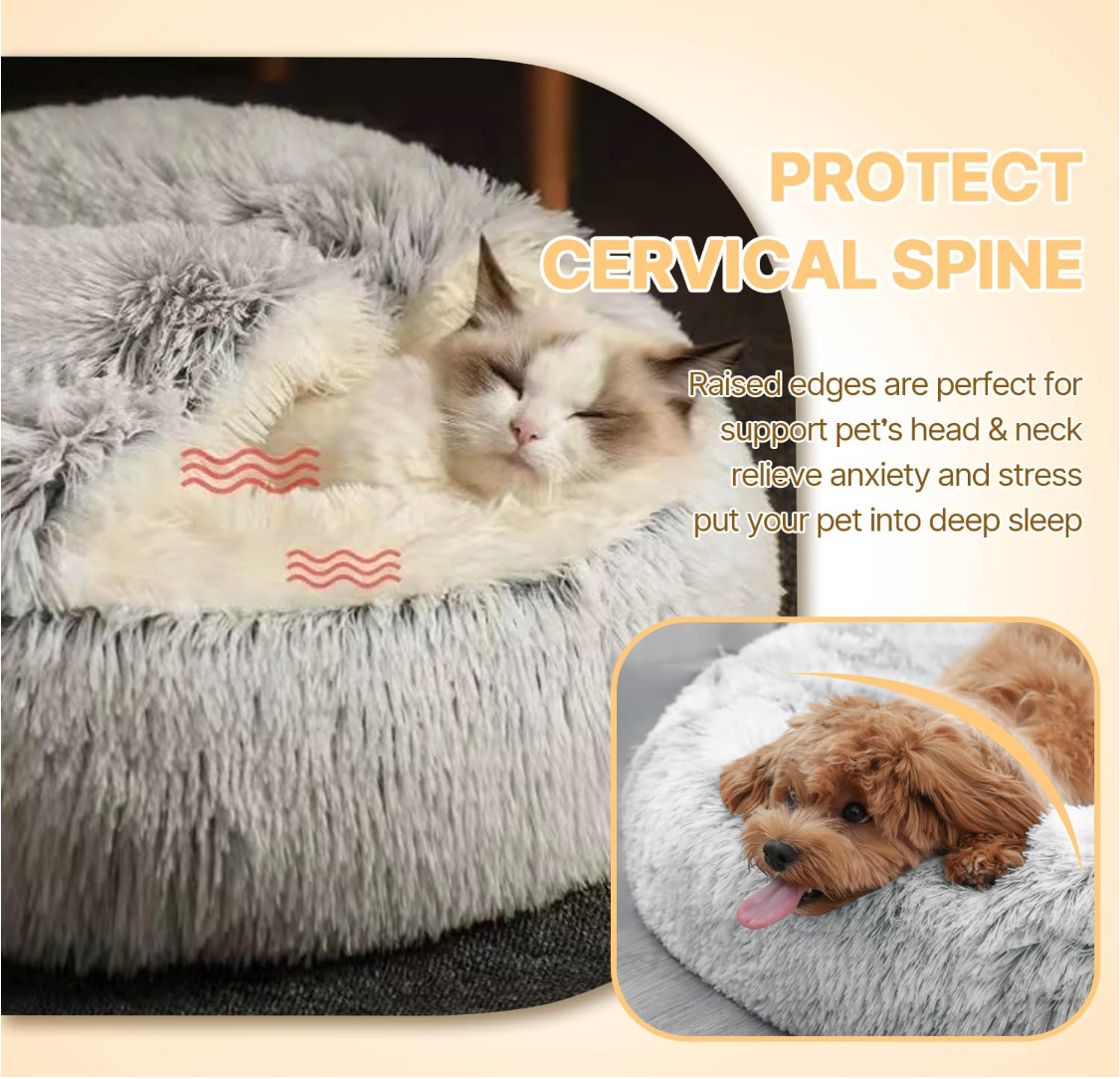 Pet-Safe Materials: Make of attractive luxurious faux fur, grey colour donut shape. A round pet bed offers a safe, Ideal for a cat or dog to snooze. Your little furry friends will feel surrounded by love and warmth, allowing them to experience truly restful sleep.
